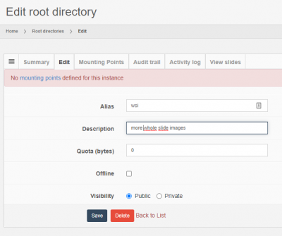 | Description | An aribitrary string that can help administrator in the future remember what your root directory actually contains. The Description field of a root directory can also be used to hide additional information about a group of data that you don't want everybody to know about immediately. Do not use this field for sensitive information, as it can be seen by everyone with access to PMA.core. If you're an instructor working with students e.g., it's perfectly ok to enter reminders for yourself in this field like “these are all trick-questions”… |