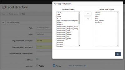 Once marked private, you can select which users are allowed to see the content of a given root directory, and which ones aren't: Do this by pressing the “Edit access control list” link after you have selected the “private” option: