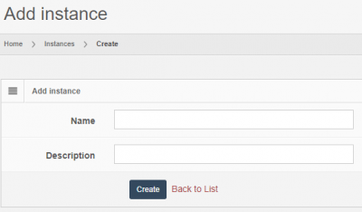 Clicking on the Add new Instance button will take you to the page to add a new Instance of PMA.core. The only required information about an Instance is a unique Name and a Description. After creating a new Instance you can set it as the current Instance via the index page by clicking on the Edit → Set current button