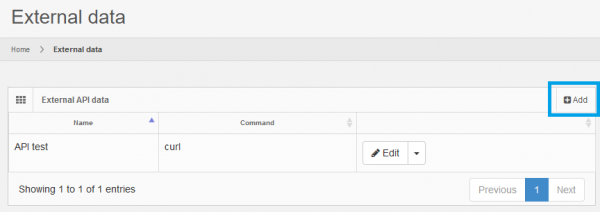 To configure your external HTTP API data link to PMA.core, click on the Add button in the External API data section of the External Data page, of the administrator front-end UI.
