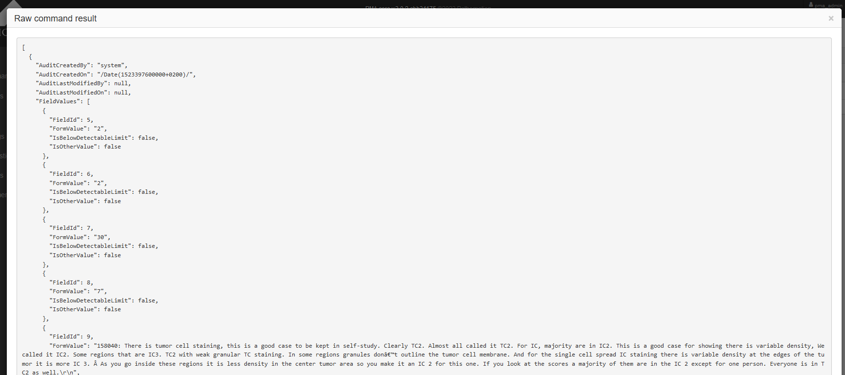 You can test the result of the command from this page. Simply fill out an image path for which the command should run and PMA.core will display the raw results of the command in a pop up: