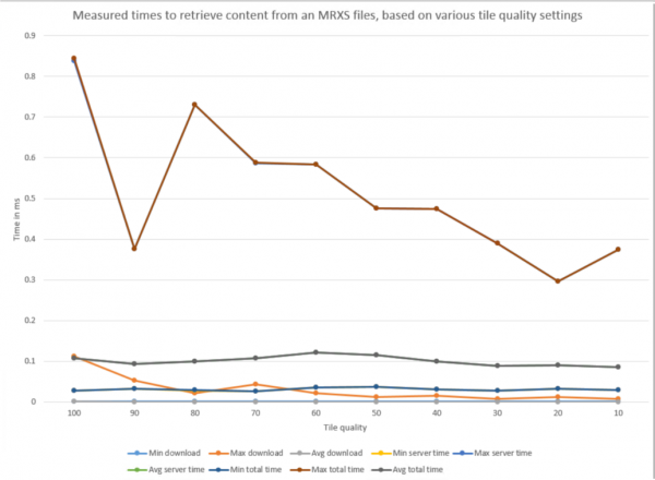 We did a survey of the impact of various quality settings, and came up with the following measurements. As could be predicted, reducing the tile quality significantly reduces the amount of bytes transferred: