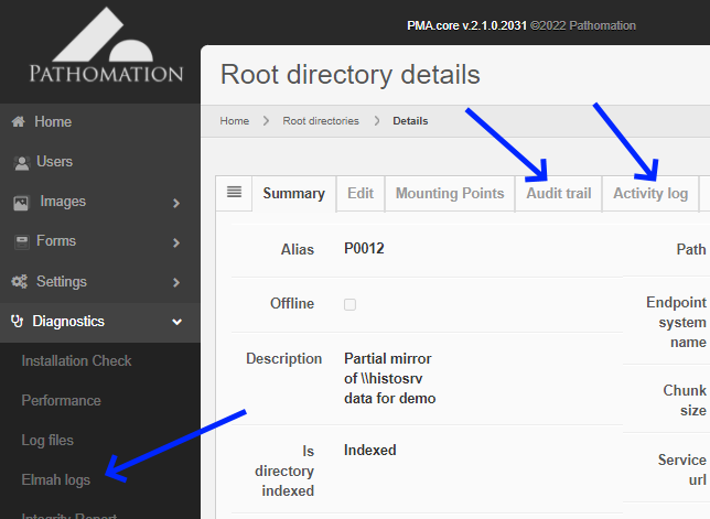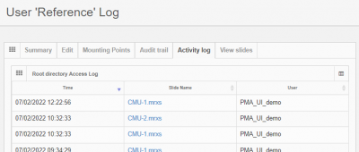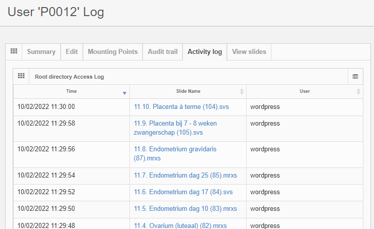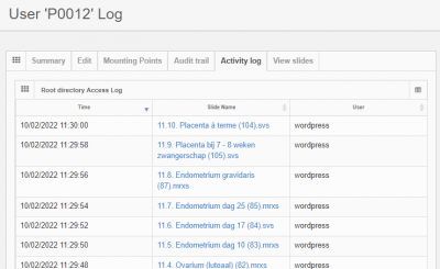 In addition to an audit trail, an activity log is available that chronologically lists which user has been accessing which slides in the root directory: