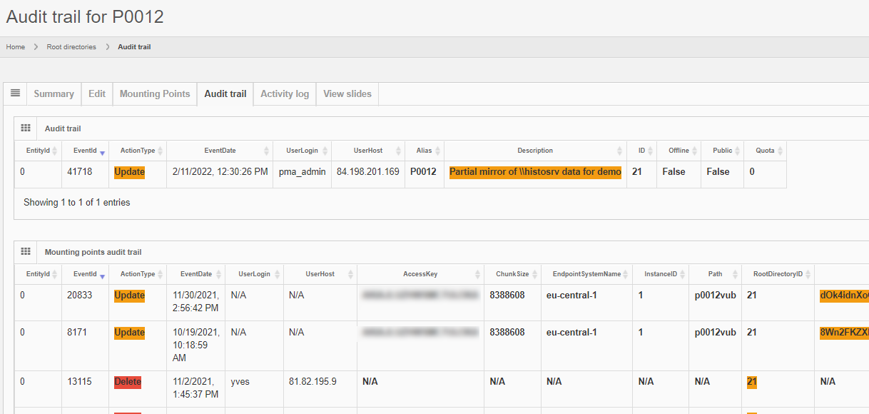 The audit trail tab combines any operations that were performed on both root directory entries and underlying mounting point entries.