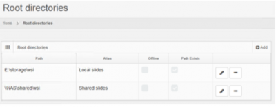 The list displays all the configured root directories and provides options to add new, edit and delete entries.
