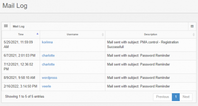A subsection of the events page showing only mail entries
