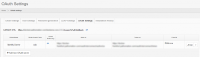 Shows the list of configured OAuth servers used for authentication by PMA.core. You can also delete, update and create new OAuth server settings
