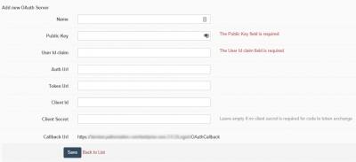 Clicking the Add new OAuth Server button will take you to the page to fill out the required info to add a new OAuth server that will be used for authentication by PMA.core. PMA.core uses the Browser Flow protocol for authentication as described the OAuth 2.0. For more information see OAuth2.0