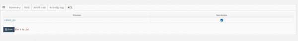 Clicking on the ACL tab will display a list of all root directories with private access and whether this user has access to each one of those. You can also grant or remove access to a particular root directory for this user.