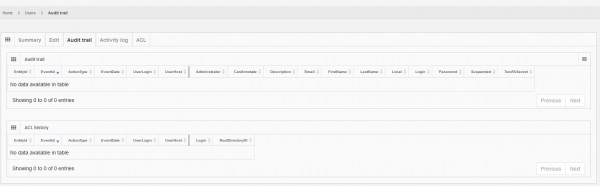 Clicking on the Audit Trail tab of a user will display a chronological list of all changes performed to a user, as well as all changes performed to the access list of that user (see access control lists)