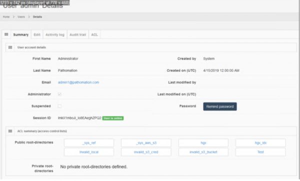 By clicking on the user's login in the overview table, you can see a summary of the user's settings and activity. This page provides an overview of the user's information and the root directories they can access.