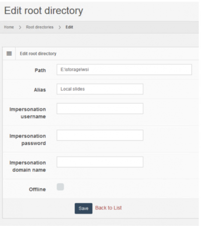 The root directories refer to the base directories where the system should look into for whole slide images. All the subdirectories of the root directories are exposed by the application and whole slide images that are discovered are advertised. A root directory may either be a local directory, a UNC share, Azure blob storage, FTP folder, or an Amazon S3 compatible storage.