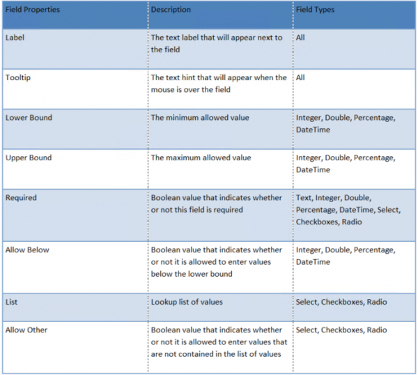 Once a field type is selected, a panel is displayed at the end of the field list containing the properties of the field. Depending on the field type, different information have to be provided in order for the field to be defined.
