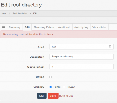 The new form that appears is also not unlike the one you used to add a new user: assign it an alias that you can use for identification and recognize, an optional description, and press the “Create” button. You can may ignore the rest of the fields for now; these are explained in detail in the dedicated chapter on root directories. Once the root directory is created, a mounting point is required that tells PMA.core where to find the slides that should be displayed under the particular root directory.