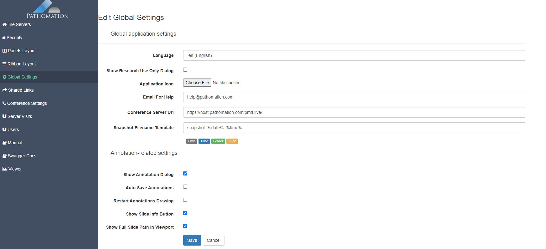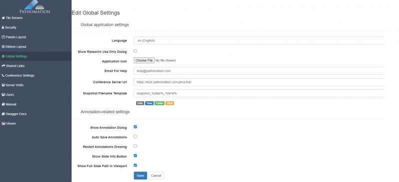 This admin page allows us to set global settings for PMA.Studio application. Page is divided into two set of fields: