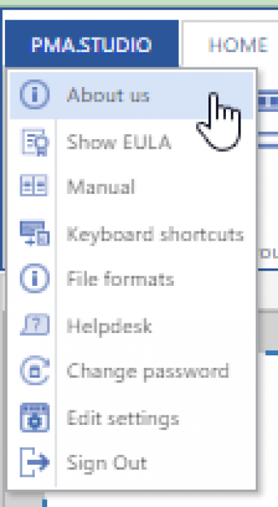 The items in the menu are the same for PMA.studio and PMA.vue.