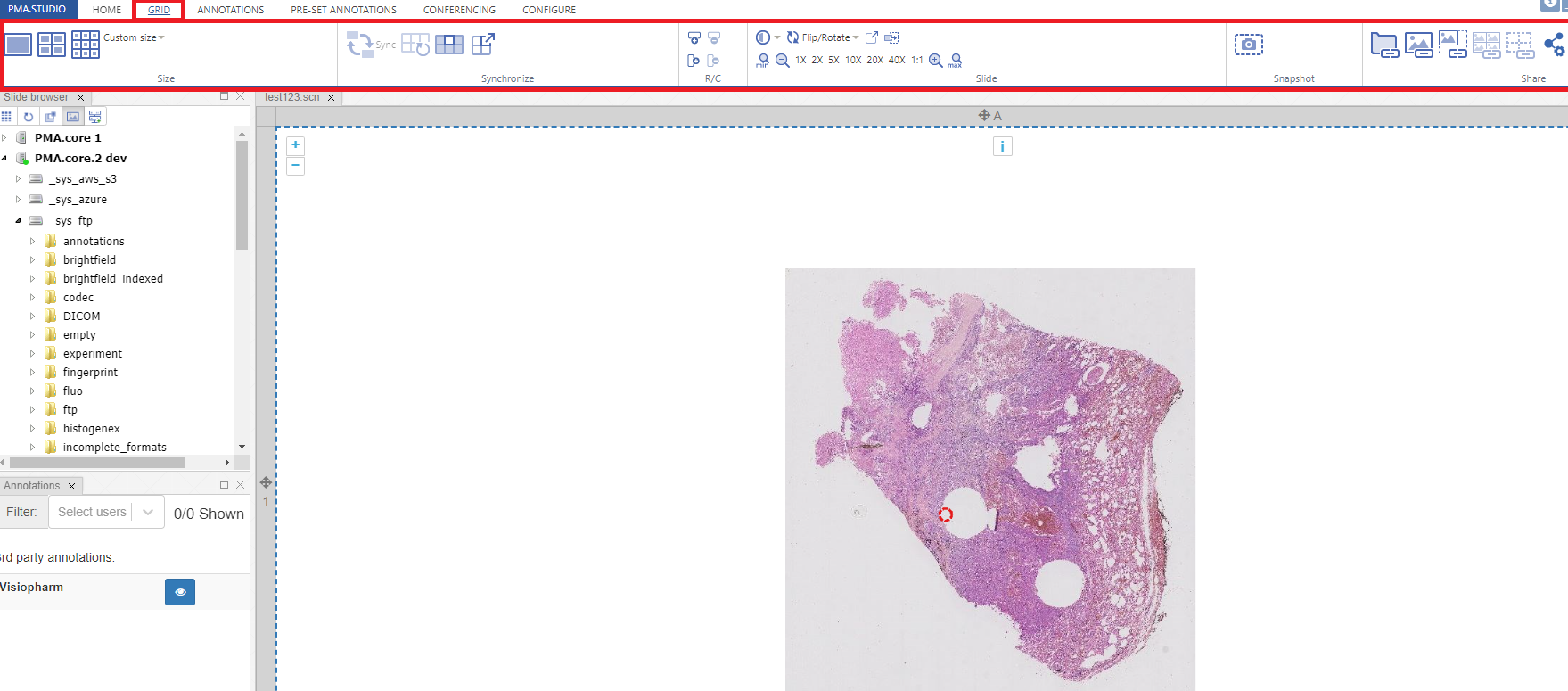 PMA.Studio allows to load multiple slides into the grid in addition to opening multiple viewer panels with grid inside. Each slide position could be changed using [i] [#1 on picture #2] button on top of viewport - it's required to drag and drop that [i] handle to the desired position - it could be either another cell, tray or new viewer panel. In addition Column/row of grid also could change it's position - there is a handle [#2, #3, #4, #5 on picture #2] near each row or column that could be drag and dropped to the required position.